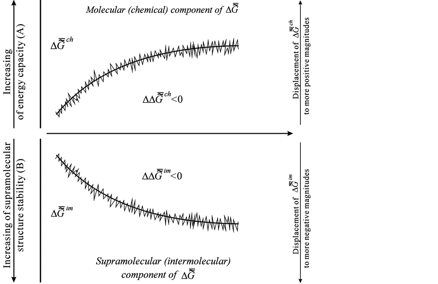 Figure 1. Scheme of changes in the specific chemical energy capacity of the biomass (biological tissue) (ch)―(A) and thermodynamic stability of its supramolecular structures during ontogenesis of living beings (im)―B.
