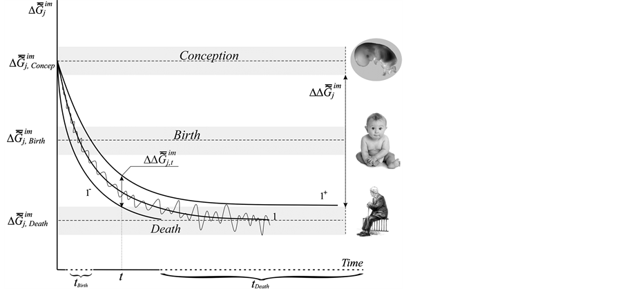 Aging of genes, chromatin, and tissues in ontogenesis goes in according with the laws of chemical and supramolecular thermodynamics of spontaneous processes and exterior environmental effects stimulating non- spontaneous body transformations. As already noted, these processes should be considered within the framework of a generalized Gibbs equation that is a generalized equation of the first and second laws of thermodynamics [24] [35] . In this case, the general Equation (1) is simplified because only the members related to molecular and supramolecular transformations should be taken into account.