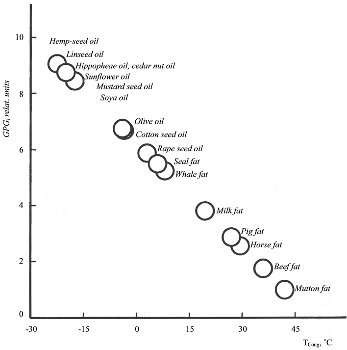 Figure 3 shows dependence of the gerontological value indicator of individual dietary oils and fats, GPGi, from their congelation temperature, TCong. These data were obtained by calculations according to Gibbs-Helm- holtz-Gladyshev Equation (2) [7] - [9] [31] . GPGi values and the corresponding TCong values are shown in the form of large circles. The calculation results are depicted in such a way as to attract the reader’s attention to the dependence of the shown indicators and several known factors of environment. Thus, the congelation temperature of the indicated food products and, consequently, GPGi indicator change considerably with a change in the concentration of components of various fats and oils in the food products. These changes depend on the age of the organisms, environmental temperature for plants and animals as well as other environmental conditions. For instance, a reference is made to the phenomenon of Ali Gazayev, which is connected with a change in the congelation temperature of sea-buckthorn berries and other plant fruits growing at different heights in mountainous areas https://gladyshevevolution.wordpress.com/.