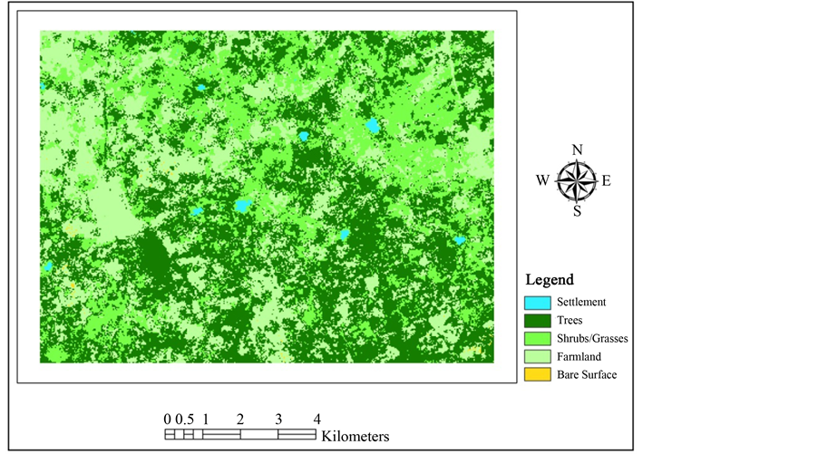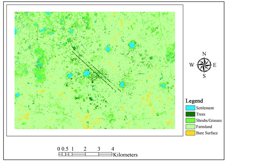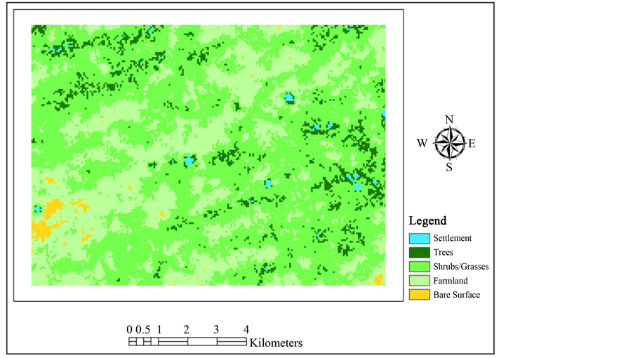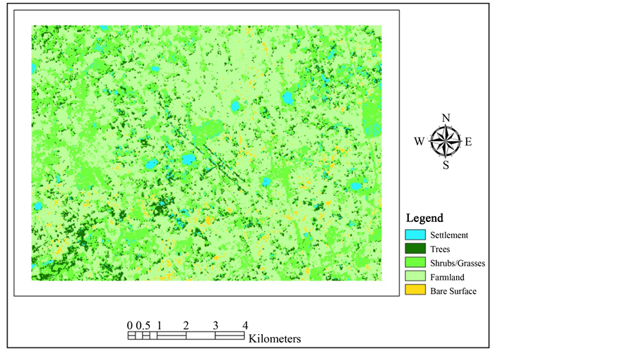 Figures 3-7 show the maps of land cover for the area. It is obvious from the results that anthropic factors rather than the establishment of shelterbelts have more influence on the observed vegetation dynamics in the study area. This is evident in the rate at which areas covered by vegetation were shrinking and giving way to other uses. The post classification results from the area show that vegetation cover in the area is decreasing mainly due to expansion of farmland. Despite the establishment of shelterbelt in the area in 1986, vegetation cover has continued to decrease. This cannot be unconnected with the increase in demand for food and other natural resources to sustain the growing human population in the area, which have contributed to vegetation depletion. The high conversion rates of vegetation to other land uses have overshadowed the salient restorative influence of shelterbelts on vegetation development. Shelterbelts are known to provide “safe sites” by sheltering areas on their lee ward side from vagaries of desert condition to a distance of about 10 - 15 times the height of the trees in the belt. The local people in the vicinity of the shelterbelt took advantage of this “safe sites” provided by the trees. They reported that the sheltered side provides conditions for higher yield than areas further away from the shelterbelt [22] . Those “safe sites” provided by the shelterbelt were the areas that suppose to have aided the natural development of vegetation. But due to pressure from human activities (especially, farming and grazing) has resulted in the continuous depletion of vegetation in the area. This was compounded by the difficult environmental conditions in the area. For vegetation to thrive in semi-arid conditions a great deal of efforts in providing water and fencing materials were required, because of the long dry season, which lasts between six and nine months. During this period a lot of pressure comes from domestic animals, which virtually do not allow any green plants especially seedlings that are not poisonous to survive. That is why grass-root participation in any afforestation project in such an environment is important.