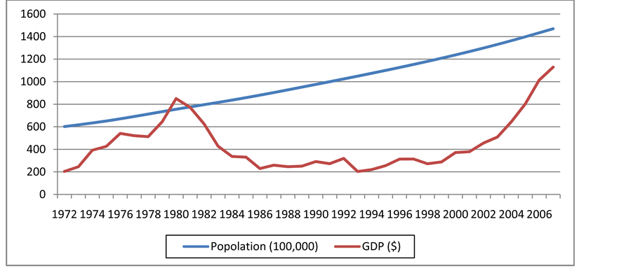 Figure 8 generally shows that the population of Nigeria has witnessed a steady growth over the years. The population was 60,191,510 in 1972, 88,057,490 in 1986, 123,688,500 in 2000, 139,823,300 in 2005 and increased to 146,951,500 in 2007. This growth in population has resulted in vegetation depletion in the country as reported by [23] . Vegetation depletion especially in the arid environment affects the ecosystem thereby resulting to desertification. Such condition creates a vicious cycle of continuous degradation which has negative effects on lives of the people residing in the area. The country’s GDP per capita has not shown any significant improvement considering the rate of population growth (Figure 8). The standard of living of the people depends
