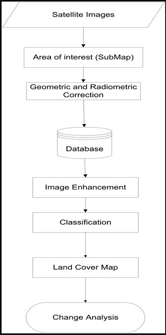 Digital image processing was carried out on the extracted area of interest to correct for geometric and radiometric errors in the data. The images were registered to each other using “resampling method” and “dark object subtraction” model of atmospheric correction was used for correction.