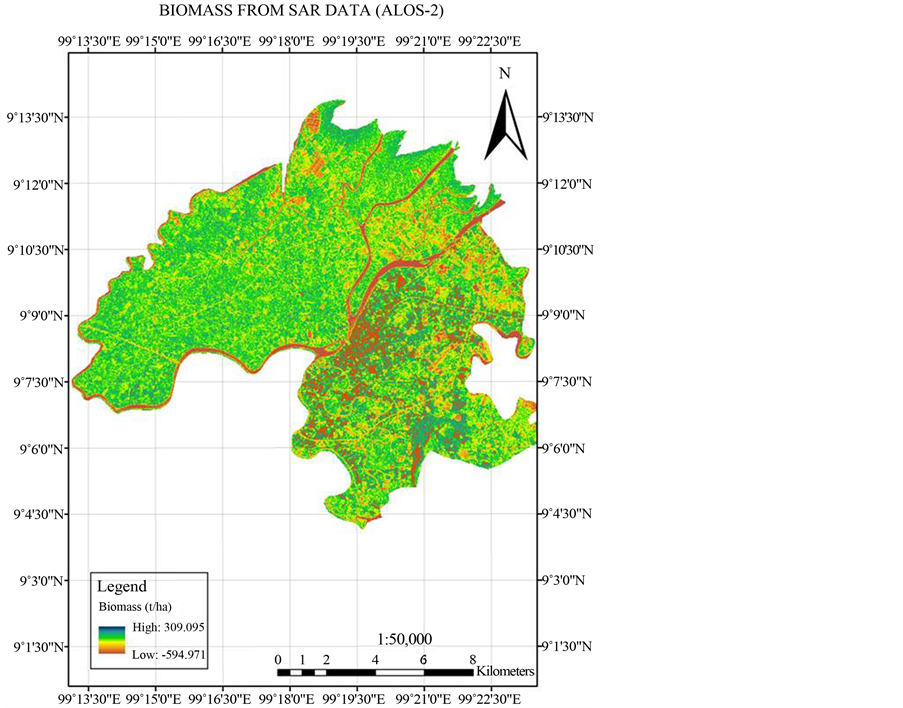 correction and radiometric calibration for calculating backscattering values. Radiometric calibration converts SAR data from DN (digital number) to backscattering coefficients (σ˚) calculated in [dB] decibel values was mainly used for biomass model generation from SAR data. The SAR backscattering value calculated for both HH and HV polarization bands of ALOS-2 to generate new biomass model by comparing with biomass calculated from field data. To reduce noise reduction in SAR image mean adaptive filtering of kernel size 5 × 5 applied to increase the accuracy in biomass estimation. In order to compare the SAR backscattering values with field-calculated biomass the pixel size of ALOS-2 increased from 6.25 m to 30 m because sample plot size in study area is 30 m. Linear regression analysis is utilized to find new biomass model from HH and HV backscattering coefficients of ALOS-2 SAR data which shows good relation with the field calculated biomass. HH backscattering coefficient was not considered in biomass model because it shows less relation (R2 = 0.405) with field calculated biomass compared to HV backscattering coefficients (R2 = 0.775). Finally accurate biomass map is produced with HV backscattering as best fit model (Figure 5).
