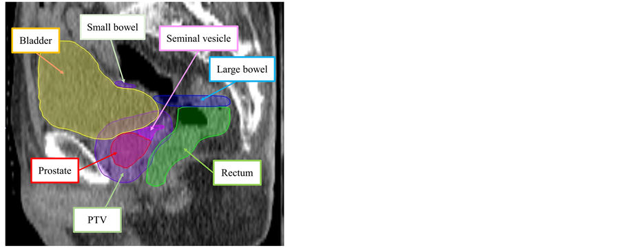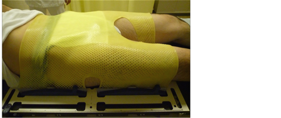 Between June 2015 and May 2016, 35 patients underwent definitive radiotherapy at Saitama Medical Center. All procedures used in this research were approved by the Ethical Committee of Saitama Medical Center. Table 1 shows the patient characteristics. The patients were irradiated in a supine position with the aid of a thermoplastic seat (Figure 1). A Light Speed RT16 (GE Healthcare, Little Chalfont, UK) was used for planning CT and acquisition of the examination CT images used to determine the reproducibility of organ conditions (4 - 6 days after planning CT image acquisition). Body surface markers placed at the time of planning CT image acquisition were used to align the CT images (2.5 mm in slice thickness). Patients were instructed to drink a fixed volume of water 30 - 60 min before CT image acquisition; urination was prohibited to enable appropriate acquisition. The CT images were examined for rectal gas by a radiation oncologist. If necessary, additional CT images were acquired based on the recommendation that the diameter of the rectum, measured transversely at the base, should be >4 cm [15] . Cone-Beam CT images have been used for evaluation of the