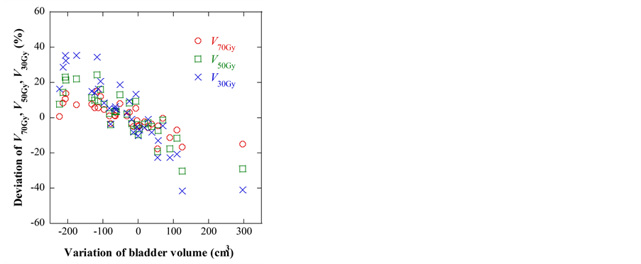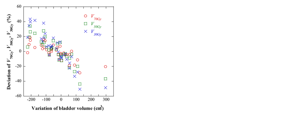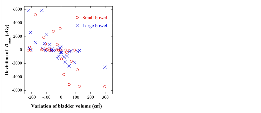 For both the small and large bowel, we found significant associations between the Dmax values and bladder volume variation. A smaller bladder moves the small and large bowel near the irradiation field [4] - [8] and increases the doses to these organs. A previous report showed that TD 50/5 of small bowel was 60 Gy (for 1/3 of the volume) and TD 50/5 of large bowel was 65 Gy (for 1/3 of the volume) [2] . It is thus important to check that the bladder volume during daily treatment is greater than that during planning CT. Additionally, it is also important to check that the doses of small and large bowel are <60 Gy and 65 Gy, respectively. If the amount of urine is inadequate, an extension of time to allow urine to collect in the bladder should be considered to reduce the doses to these organs. The criteria whether the amount of urine is adequate can be decided by using the bladder volume and the doses to the OARs during planning CT, the dose constraints, and the regression coefficients in this study.