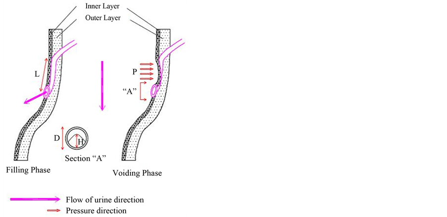 Figure 1 illustrates diagrammatic representation of the functional anatomy of the ureterovesical junction and urinary anti-reflux mechanism as the accumulation of urine within the bladder will lead to the tight closure of the portion of the ureter in between, thus preventing the backward return of urine to the kidneys, urinary anti- reflux mechanism. In Figure 1, P, D, H and L are intravesical pressure, intramural ureter diameter, injected mound height, and intramural ureter length, respectively. Section “A” in Figure 1 depicts the cross section of the intramural ureter with injected mound. The geometrical data of the intramural ureter and ureterovesical junction for children aged between 2.5 to 10.5 years were utilized as per Table 1.