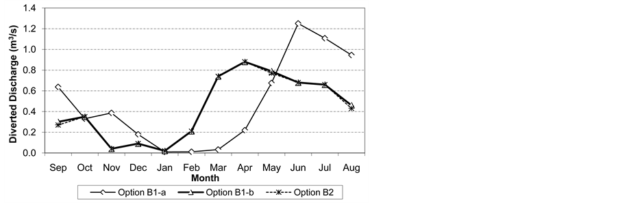 Figure 5. Average diverted discharges from the diversion weir for the different alternatives (the selected sub-alternative B1-b is shown in thicker lines).