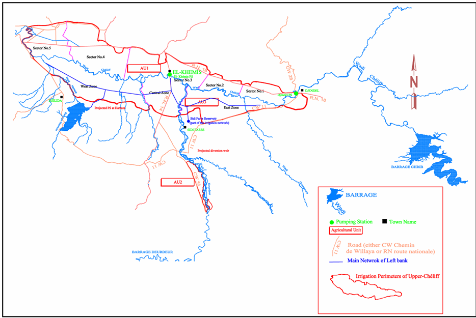 The Study Zone is the plain of El-Khémis, which is confined between two mountainous chains in Algeria. El- Khémis is located in the Upper-Chéliff (Algeria), which constitutes with Middle-Chéliff, Lower-Chéliff and Mina the valley of Chéliff, which is the longest Wadi in Northwest Africa. The Chéliff Valley approximate area is 61,500 ha, which is equivalent to half of the Algerian irrigated lands. El-Khémis irrigated plain (more than 20,000 ha) is formed of two banks; the 10,850 ha right bank and the 9267 ha left bank. Both banks are provided with irrigation pressure networks. The two networks are not linked. Figure 1 presents a map of the Study Zone.