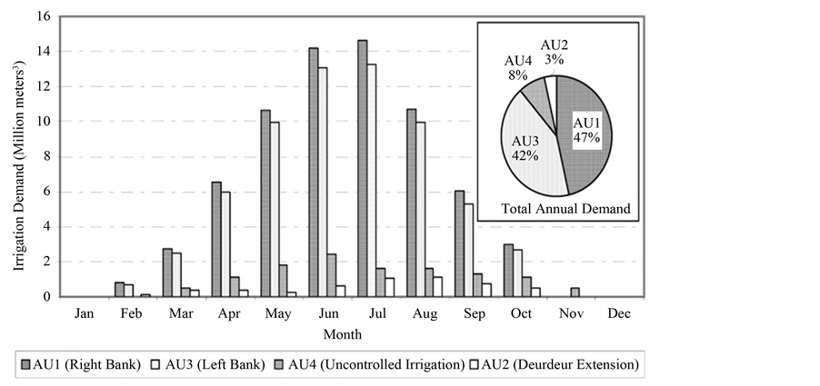Water demands for urban and industrial purposes are shown in Table 3 and those for irrigation purposes are shown in Figure 2. Agricultural Unit (AU) hereafter denotes each irrigation zone. The calculated average water requirement is 8010 m3/ha/yr for the right bank of Chéliff (AU1), 8265 m3/ha/yr for the left bank of Chéliff (AU3), and 5215 m3/ha/yr for the lands irrigated solely by Deurdeur dam (AU2).