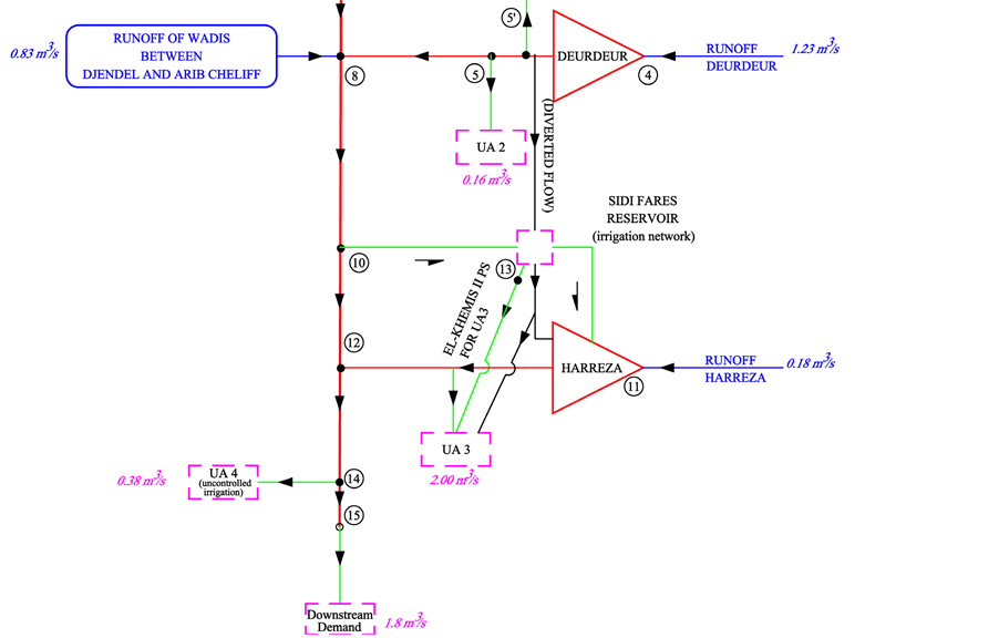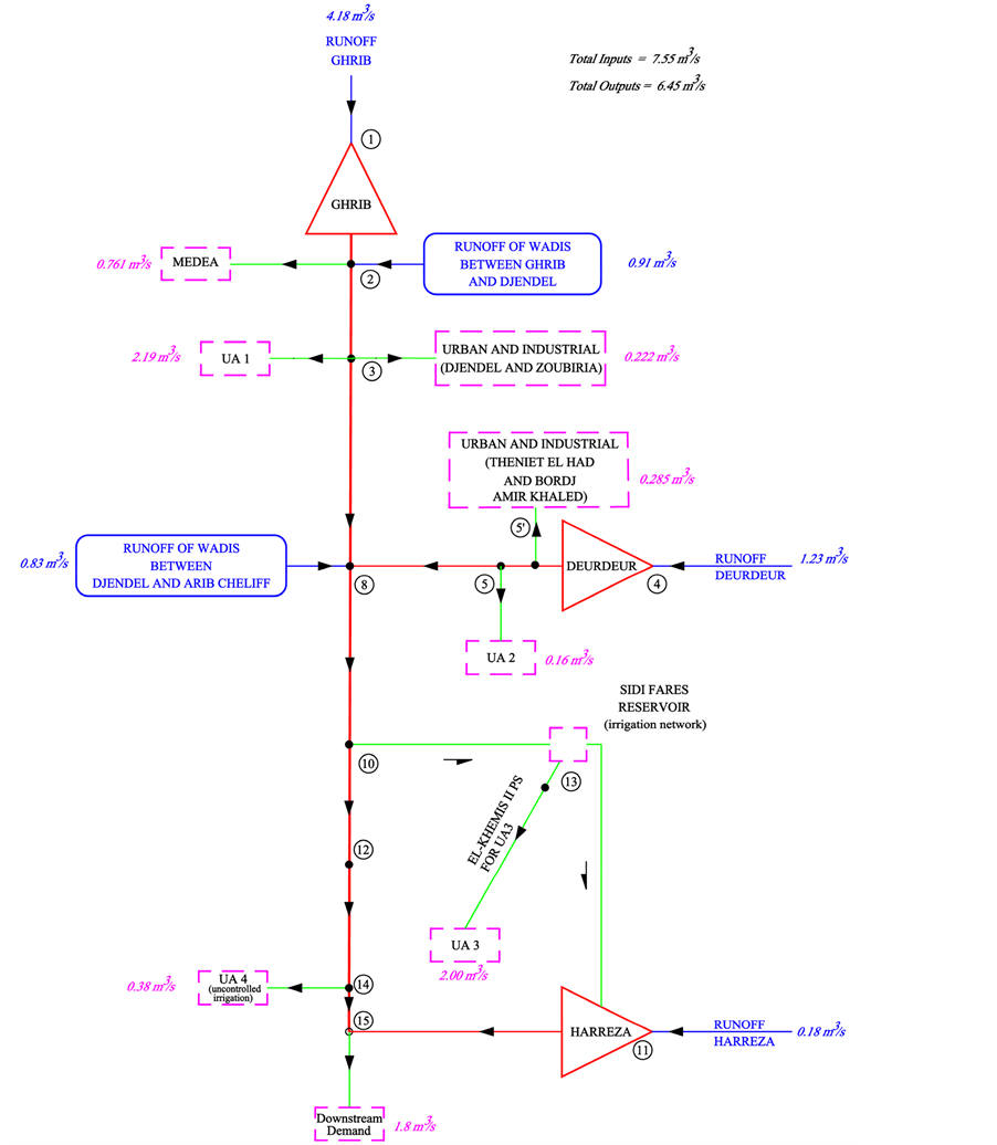 The conceptualization of the current system demands, supplies and control structures (base or current situation, case A) of Upper-Chéliff are shown in Figure 3(a) and Table 5. It comprises: 1) runoffs of gauged and non- gauged basins, 2) the three existing dams of Ghrib, Deurdeur and Harreza, 3) urban and/or industrial water supply (provided by Ghrib and from Deurdeur); and 4) irrigation supply to units AU1, AU2, AU3 and the irrigated lands out of the sprinkler system network (AU4).