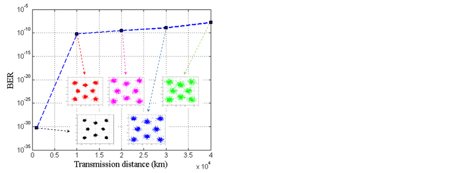After transmission, as the received signal to noise ratio (SNR) of the 10 Gbit/s 8QAM-OFDM signals is 20 dB, the relationship between the bit error rate (BER) and different optical links leng this shown in Figure 6. It is clear to see, if the transmission distance is longer, the values of the BER of the two 8QAM-OFDM optical access signals will increase. As the transmission distance is less than 10 km, the BER values of two types of 8QAM-OFDM optical access signals are lower than 10−10. While the transmission distance is 40 km, the BER value of the first type of 8QAM-OFDM optical access signals is bigger than 10−6, and the BER value of the second one is less than 10−6. If the downlink length is longer, the receiver sensitivity is higher for the second type of 8QAM-OFDM optical signals access application.
