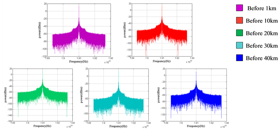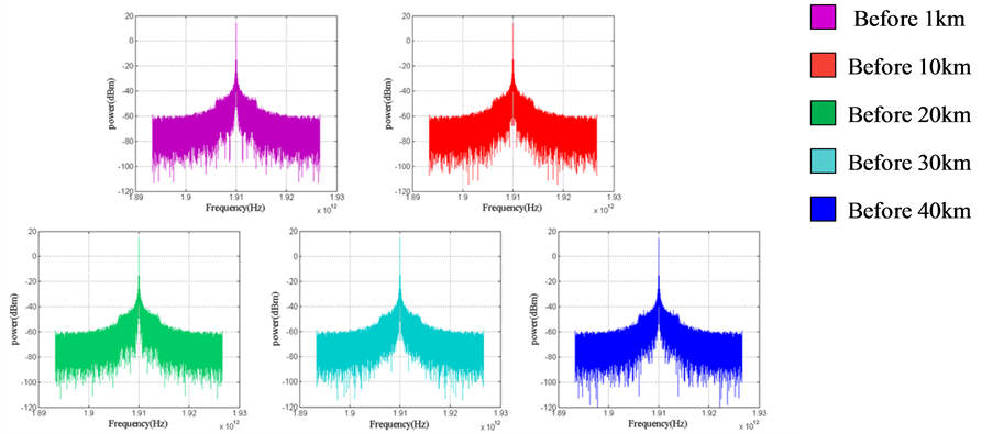 Figure 4. Optical spectral diagrams of the first type of 8QAM-OFDM optical access signals before transmission over different length SMFs.