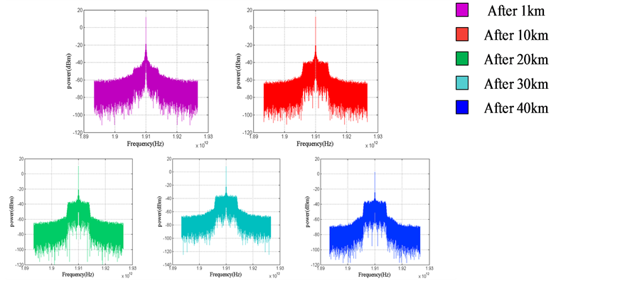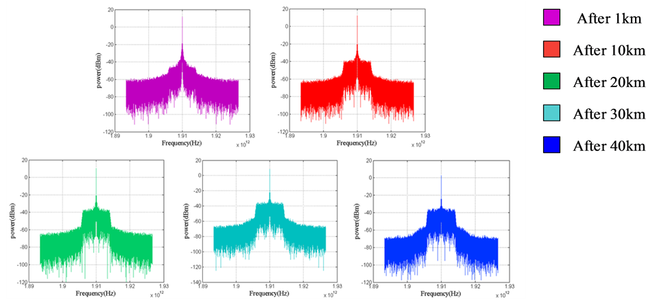 Figure 3. Optical spectral diagrams of the second type of 8QAM-OFDM optical access signals after transmission over different length SMFs.