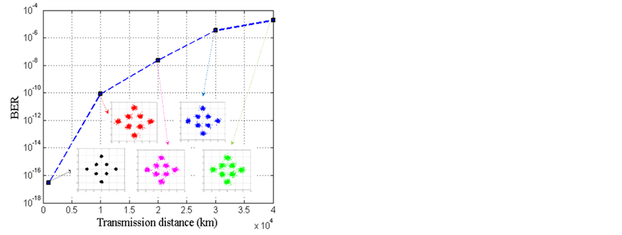 At present, with the rapid increase of the types and number of broadband communication access services, the development trend of optical access system is mainly focused on high frequency band utilization and user bandwidth [1]-[4]. Orthogonal frequency division multiplexing (OFDM) optical access technology as a multi-carrier modulation technology has received more and more researcher’s attention [5] [6]. The reason is that it has a good ability to resist chromatic dispersion (CD) and polarization mode dispersion (PMD), and the spectrum utilization rate is high and the flexible multi-service bandwidth allocation can be realized by using a large number of sub carriers [7] [8]. In this paper, the downstream transmission of two types of 8QAM-OFDM optical signals in broadband optical access system has been compared and analyzed. After modulation and coding in this scheme, the two types of 8QAM-OFDM optical access signals are downlink transmitted successfully over single mode fiber (SMF) with 1 km, 10 km, 20 km and 40 km distance at 10 Gbit/s. Different transmission distances impact on the bit error rate (BER) of the received signal is analyzed by simulation, while the signal to noise ratio (SNR) is 20 dB.