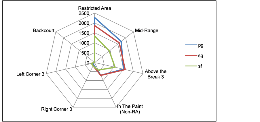 The distributions of shooting data of players of 3 positions at 7 locations are shown in Figure 2 with radar map. We can see that the data also shows similarities.