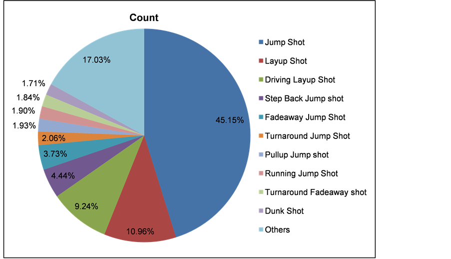 The top 10 scoring methods are listed in Figure 4 and the rest are combined into one. The top three methods are Jump Shot, Layup Shot and Driving Layup Shot. Two-thirds of the total are consisted of them.
