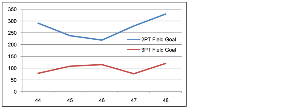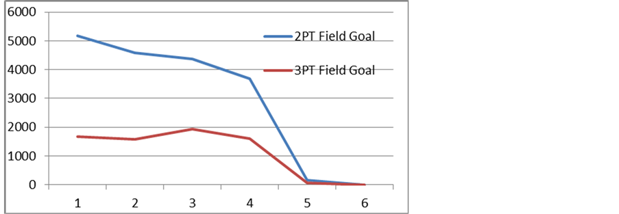We discover that the number of two-point shots is the smallest and that of three- point shots is the biggest at the 46th minute. We think that maybe it is the crucial time in a close game and there’s still possibility to cover the gap between points by successful three-point shots. As time goes by, the chance of closing the gap keeps decreasing after the 46th minute and many teams will choose to accept the result without struggling anymore.