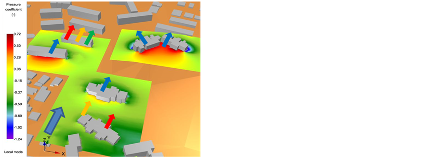 Some ΔCp mappings are shown at Figure 8 for the main wind direction. The buildings layout may be optimized in order to allow enough pressure on walls for each volume. Porosity of façades was defined according to the variability of ACH. Computed thermal loads depend on the location of the volume in the building (ground, middle, top) and on the location of the building in the master plan (exposed, protected, shaded