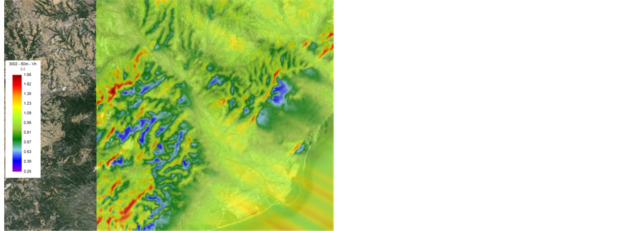 ・ Transferring wind data from a weather station to a 200 m high area over the urban area. We use the CFD software Topowind [6] which through Navier-Stokes equations resolution (multigrid coupled MIGAL-S solver for structured grid) using a k-L turbulence model, evaluate the effect of orography and terrain roughness on the flow. A horizontal resolution of 25 m, leads to a numerical grid of about 20 M cells for a computational time of 5 h per wind direction (18 sectors of 20 deg width). A mapping of the resulting wind speed coefficients for one synoptic wind direction is shown in Figure 1. The obtained wind characteristics over the city are used as the input for the subsequent micro-scale downscaling computation.