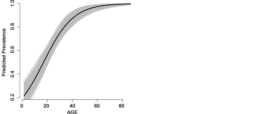 The 95% confidence intervals for predicted prevalence by using both parametric and non-parametric methods are presented in Figure 1 and Figure 2 respectively. It can generally be concluded that the probability for infection increases with age. The length of the interval reduces with increase in Age. This means prediction for higher age is more precise.
