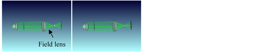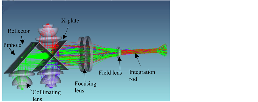 RGB light from LEDs is collimated by micro objective, then overlapped by an X-plate, focused into integration rod. Decoherenced green Lasers are imported from the pinhole in the reflector plate, as depicted in Figure 1. Both Lasers and LEDs have the same optical axis. Unlike conventional design, field lens are added at the focal plane , which is near the entrance of the integration rod, as depicted in Figure 2. Because the field lens are at the position of the image place of LEDs, so they have a very small impact on the features of the image such as size, angle and Etendue.