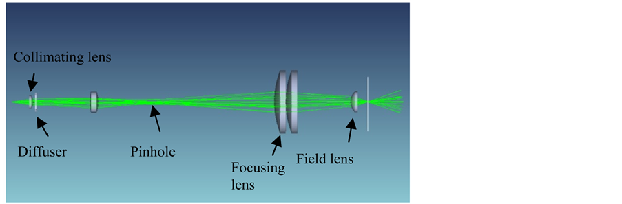 Green lasers from fibers are decoherenced by a diffuser, the decoherenced lasers are imaged into the position where a pinhole is placed, as depicted in Figure 3. Careful design of the diameter and the location of the pinhole in the optical system are needed, to meet the following requirements: