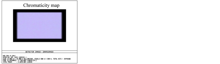 In the simulation, we put six detectors at the exit of the integration rod, each detector can obtain illumination information and color coordinates. The simulation results show that a good color uniformity of Δx’y’ < 0.01 and a good illumination uniformity of >90% can be achieved (Figure 5).