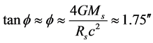Where the gravitational force is greater and the gravitational potential is deeper, the bending of the light is more powerful. The General Theory of Relativity predicts that the photon will be deflected at the edge of the sun, and deflection angle is: