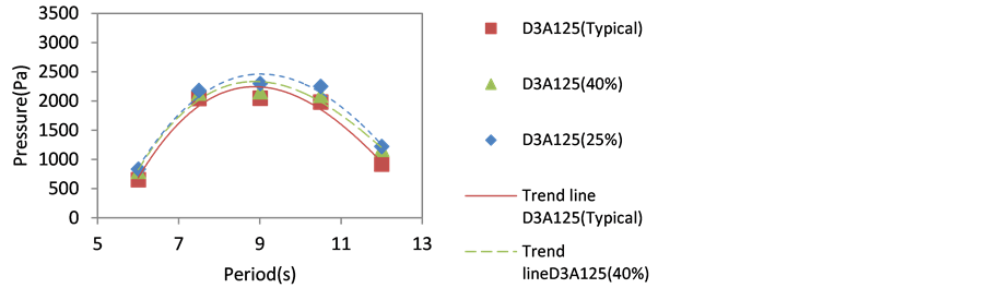 Figure 4. The air pressure (average of 1/3 maximum) in the cell for various period of wave.