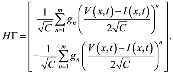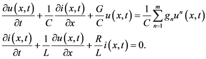 A lossy transmission line with distributed nonlinear resistive element can be prescribed by the following first order nonlinear hyperbolic system of partial differential equations (cf. [1] - [14] ):