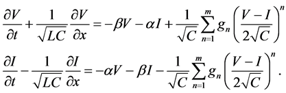 Figure 1. Lossy transmission line with distributed nonlinear resistive element with an interval of negative differential resistance in the characteristic.