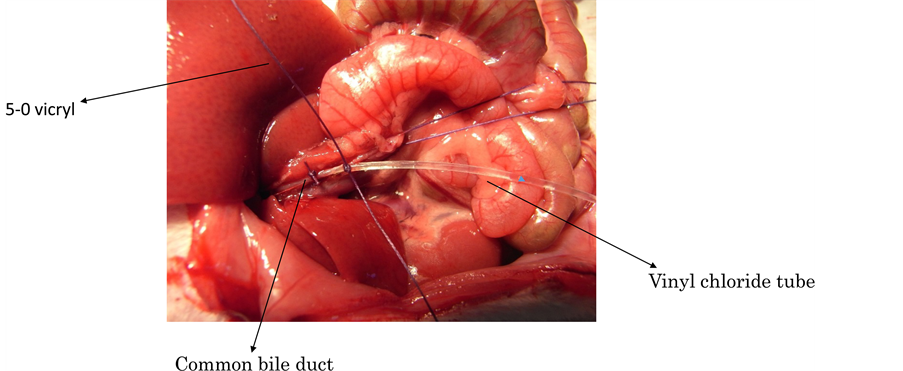 Laparotomy was carried out under general anesthesia. The bile duct was exposed, divided and ligated distally with two 5-0 vicryl ligatures. A vinyl chloride tube (length 30 mm, external diameter 0.61 mm, internal diameter 0.28 mm, Becton Dickinson and Company) was used as a stent. One end of the tube was inserted into the divided CBD 5 mm distal to the hepatic confluence and ligated in place with 5-0 vicryl (Figure 1). The other end was inserted into the 18 G needle which was inserted through the jejunum from the mesenteric side to the antimesenteric side of the jejunal lumen 25 cm distal to the ligament of Treitz (Figure 2). After the 18 G needle was removed from the jejunum, proximal end of the tube held in place with a purse-string suture with 5-0 nylon, which was ligated with 5-0 vicryl in common bile duct (Figure 3). The ligated CBD tube brought out through the mesenteric side of the jejunum was cut just enough to re-es- tablish bile flow. The cut end spontaneously retracted into the intestinal lumen. And the hole in the jejunum was closed with a stich using 5-0 nylon (Figure 4).