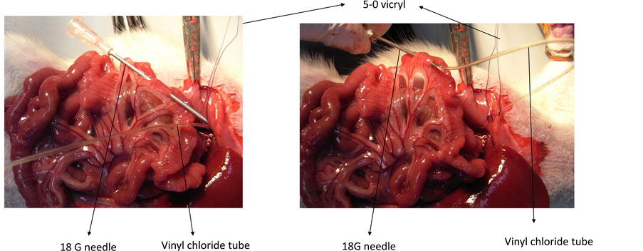 Figure 2. The other end of vinyl chloride tube was inserted into the 18 G needle which was inserted through the jejunum.