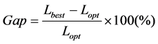 4) Gap (%): The relative error of the length of the best tour to that of the optimal tour, which is formulated as Equation (2):