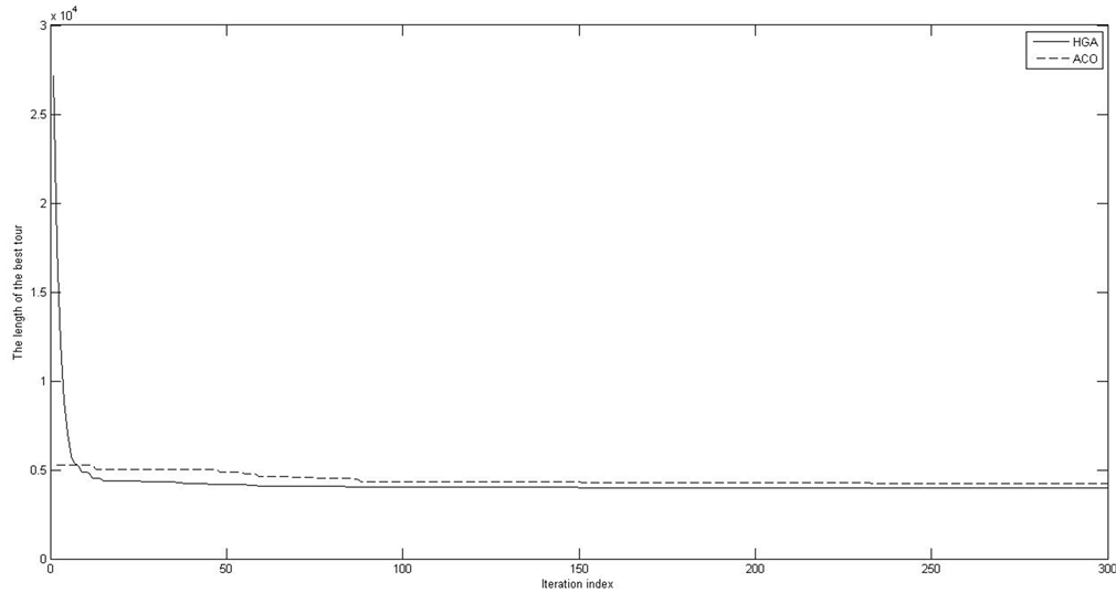 Therefore, HGA performs more effectively and efficiently than the traditional ACO in terms of the convergence rate and the solution quality.
