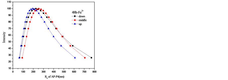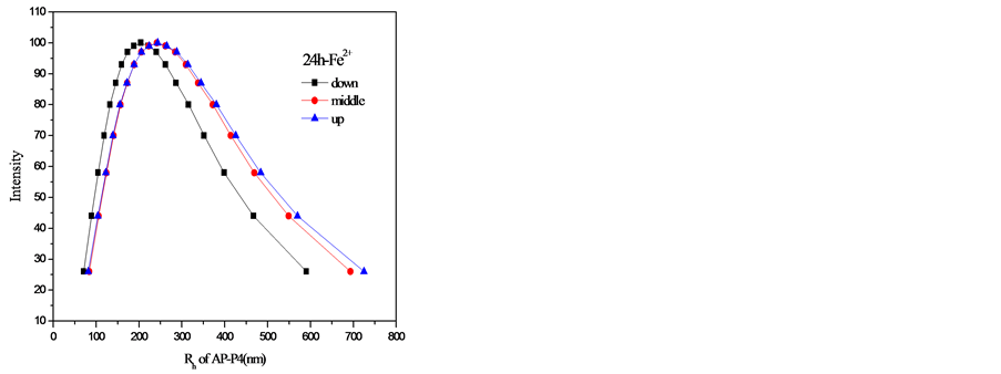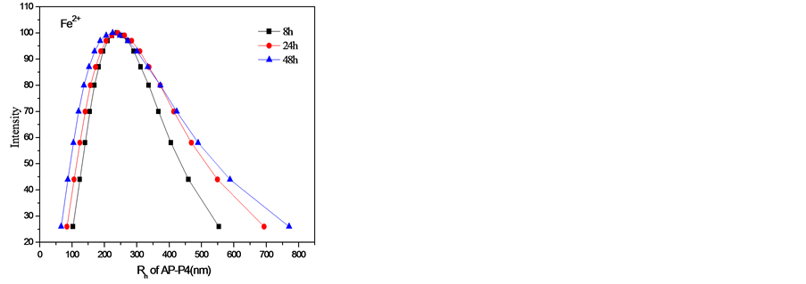 time. For blank residual HMPAM solution, the Rh had no great change with time. When there was Fe2+ in solution, the Rh had no great change with time, too. The results showed that the increasing of I1,t/I1.0h was caused by the increasing number of HMPAM aggregate.