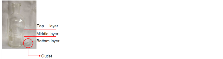 Firstly, four tubualted bottles were kept at 65˚C for 0 h, 8 h, 24 h and 48 h, respectively. Then, different samples were obtained successively from the bottom of tubualted bottle. The first 50 mL was the bottom solution, the intermediate 100 mL was the middle solution and the last 50 mL was the top solution.