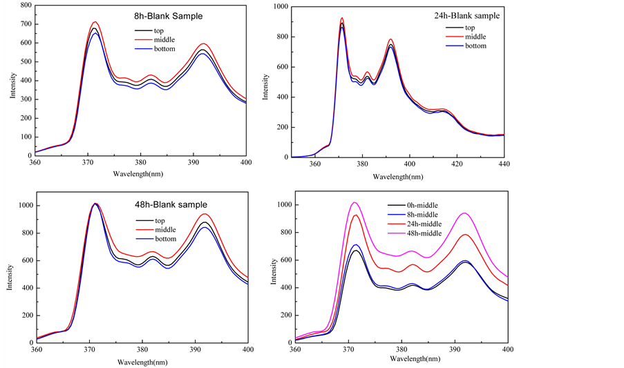 Figure 4. Fluorescence spectrums of blank residual HMPAM solution at different layers and different time.