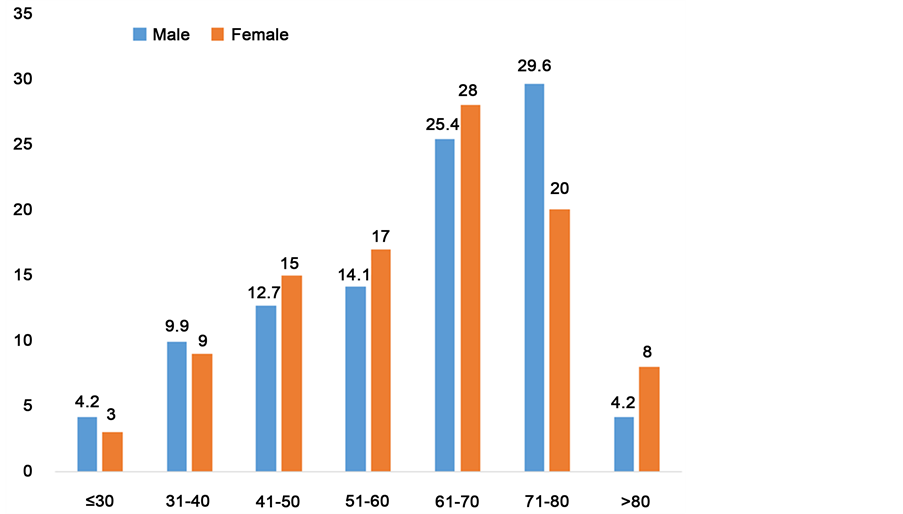 age was 59.2 ± 15.4 years, and ranged from 20 to 84 years. Most patients (26.9%, [95% CI: 20.8 - 34]) were in the 61 to 70 year old age group (Figure 2). There was no significant difference in the age distribution according to sex (all p > 0.05).