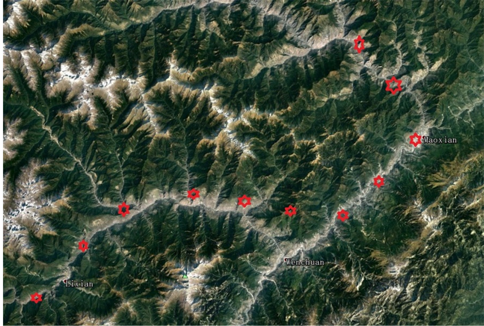 pressure is common in convergent plates, such as the collision between the India Ocean plate, the front of the India continent, and the Eurasian plate. Tension is common in isolated plates, such as submarine expansion in the Red Sea rift or Great Rift Valley. Pressure and tension are complementary in crustal movement. For example, many faults are not separated from inland plate tension caused by the convergent plate, such oceanic plate subduction causing continental plate pressure, leading to uplift. However, this inevitably causes plate weakening and rifting. The aim of this study is to deploy an electromagnetic spider web that can capture the effects of such geophysical changes. After the Wenchuan earthquake occurred in 2008, many researchers began to monitor the geological activity in the Longmen Mountain fault zone. Our study is based in the Longmen Mountain area, and we use Google Earth to find suitable installation equipment locations for deployment [7] [8] [9] .