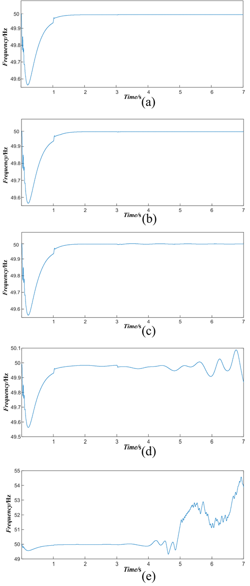 As is shown in Figures 7(a)-(c), for the increase of load, the system frequency declines and it takes about 1s for frequency to restore to 50 Hz. However, when time delays are chosen to be 0.3 s and 0.5 s, shown in Figure 7(d), Figure 7(e), the frequency oscillates and the system is unstable.