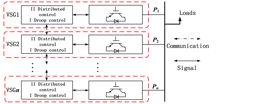 It can be seen from Figure 4 that the coordinated control structure of VSGs is performed at two levels. Active power-frequency droop control is implemented for primary level. At the second level, the distributed control is utilized to exchange information between neighbor VSGs, thus achieving frequency restoration and reasonably active power sharing.