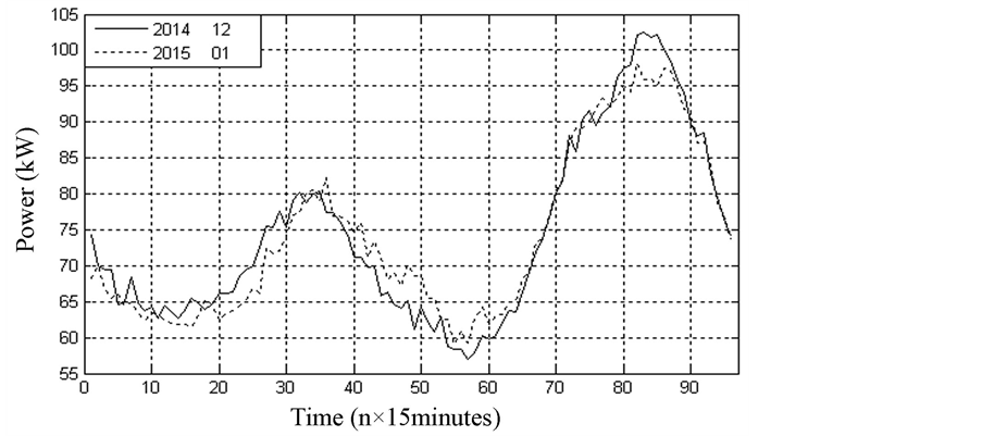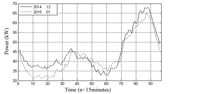 It is proved that all daily load curves of 6transformer districts are similar, and the variation of load power is roughly the same. Three of them are arbitrarily chosen to plot the average load curves (here Number 1, 3, and 6 are taken for examples). The plotting method is that: for each day of a month, the average value of the same time is used as one point on the curve, and in this way all 96 points, which finally form a curve, are plotted. According to the actual situation in Tianjin, December and January is the coldest months, in which the load curves have been plotted with the above method. The average load rate of Figure 1 changes in the 10% - 20%, and the average load rate of Figure 2 changes in 6% - 15%. In Figure 3 the average load rate changes between 5% - 11%, so the 6 distribution transformers in the community work at low load rate. In addition, the time of the higher load rate appears at 8:00-9:00 in the morning and 21:00-22:00 in the evening, and the wave crests present “one small one big” shape, as shown in Figures 1-3.