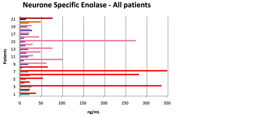 The normal value is inferior to 18 ng/mL (Porte de Hal Medical Analysis Laboratory, Brussels, Belgium). The biological half-life in the body fluids is approximately 24 hours. The neuronal destruction can cause a release of NSE with high concentrations lasting for 36, even 48 hours [4] [5] [6] [7] [8] . Therefore the measurement of NSE has been used to differentiate the diagnosis of the neuron-destructive and neuron degenerative disorders such as brain injury, encephalitis, stroke, recent epileptic seizures and dementia [9] - [17] .