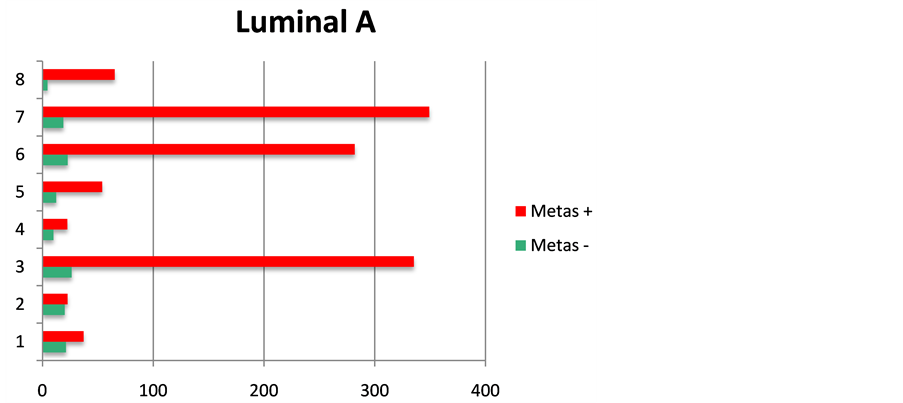 Figure 1. All patients included in the study were matched based on the subtype of breast cancer. Light red bar: luminal A with BM, Green bar: luminal A with NBM; Rose bar: luminal B with BM, Mauve bar: luminal B with NBM; Orange bar: HER2 positive with BM, Light green bar: HER2 positive with NBM; Dark red bar: Triple negative wth BM, Dark blue: Triple negative with NBM.