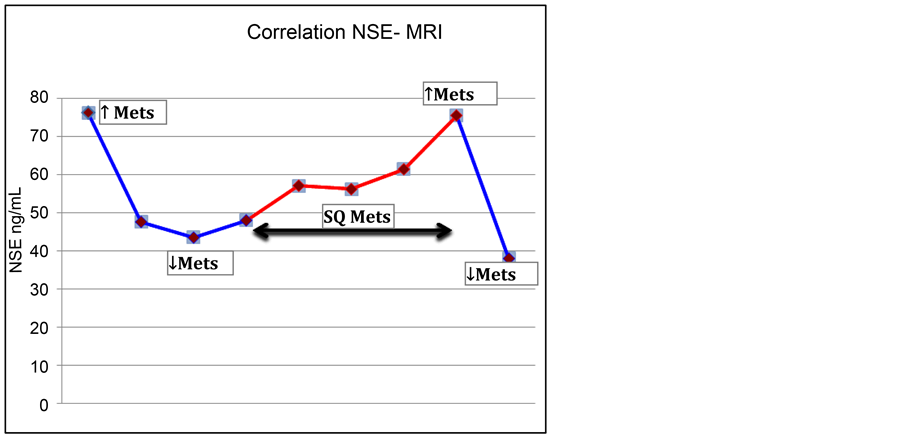 In Figure 7 one can observe the sensible correlation of the NSE value and the evolution of the parenchymal dissemination. We note that in the period from April 2013 and August 2013 the patient had multiple cerebral MRI examinations each time indicating a stable disease according to RECIST1.1 criteria [23] . If we closely examine the MRI images we can actually observe a slight progression of the lesions (see Figure 7). We could hypothesize that the NSE is a much more sensible marker correlated to the brain lesions evolution even before a clear progression on the MRI.