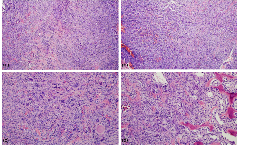 Figure 2. ((a), (b)) Histopathological findings showing multinucleated giant cells dispersed in a proliferation of spindled cell stroma (hematoxylin and eosin stain, magnification × 100). ((c), (d)) Some mitotic figures in mononuclear stromal cells were observed with areas of osteoid production (hematoxylin and eosin stain, magnification × 200).