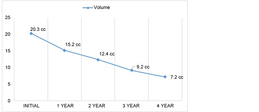 Figure 3. Tumor volume response diagram throughout the years. Initial volume described as the postoperative volume.