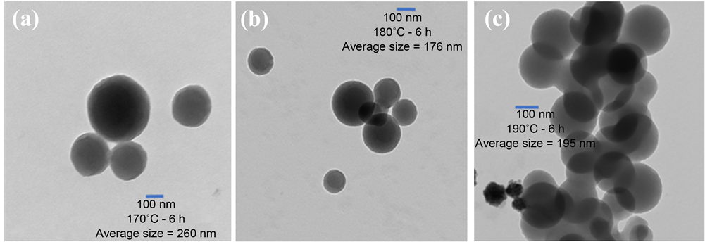 Figure 1. TEM images for as synthesized CNs for 6 hours, images (a), (b), and (c) represent the CNs synthesized at temperature 170˚C, 180˚C, and 190˚C, respectively.