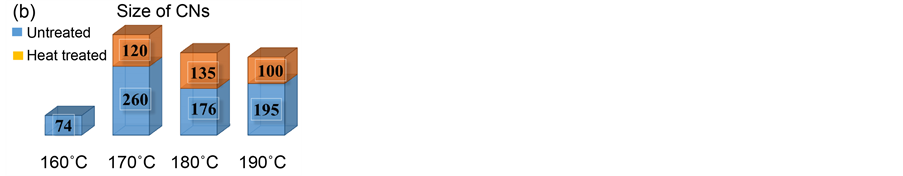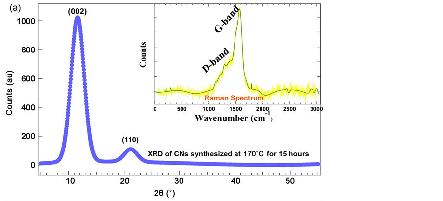 Figure 4. The XRD patterns of CNs synthesized at 170˚C for 15 hours, figure (a), and inset shown in figure (a), is the Raman spectrum of CNs synthesized at 140˚C for 6 hours, and a histogram of size distribution of CNs before (bottom bar) and after (top bar) heat treatment, figure (b).